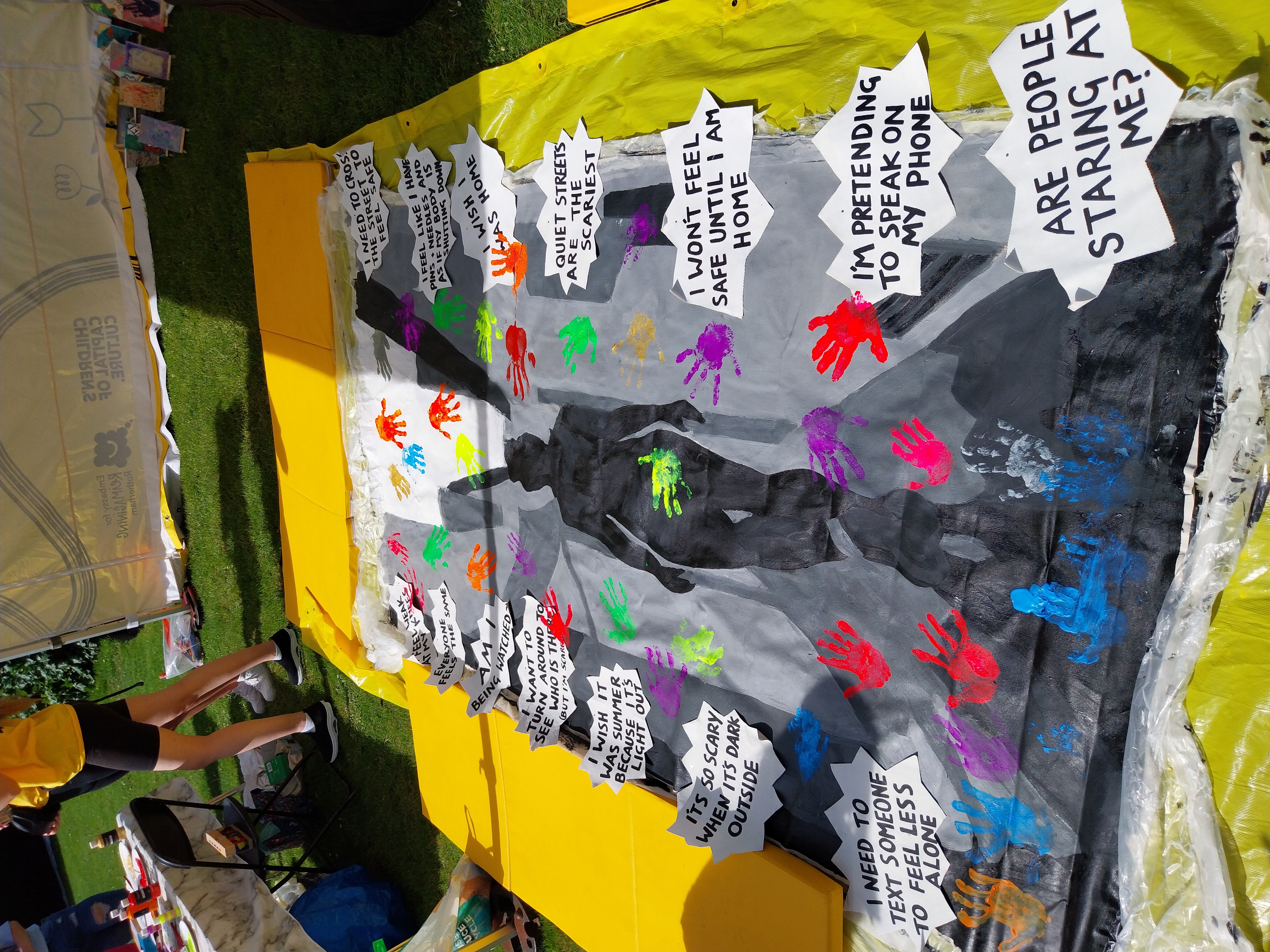 The festival day was an overwhelming experience, seeing the sense of community and solidarity amongst women, girls and non-binary people and how everyone could relate and felt connected with each other was beautiful. The project took little explanation due to the fabulous soundscape created to play alongside it and was unfortunately a very relatable topic for most attendees. But the results were incredible, so many people added their handprints to the mural and covered our thoughts and fears with an array of bright, bold and fantastical colours to make something beautiful out of something so sombre.